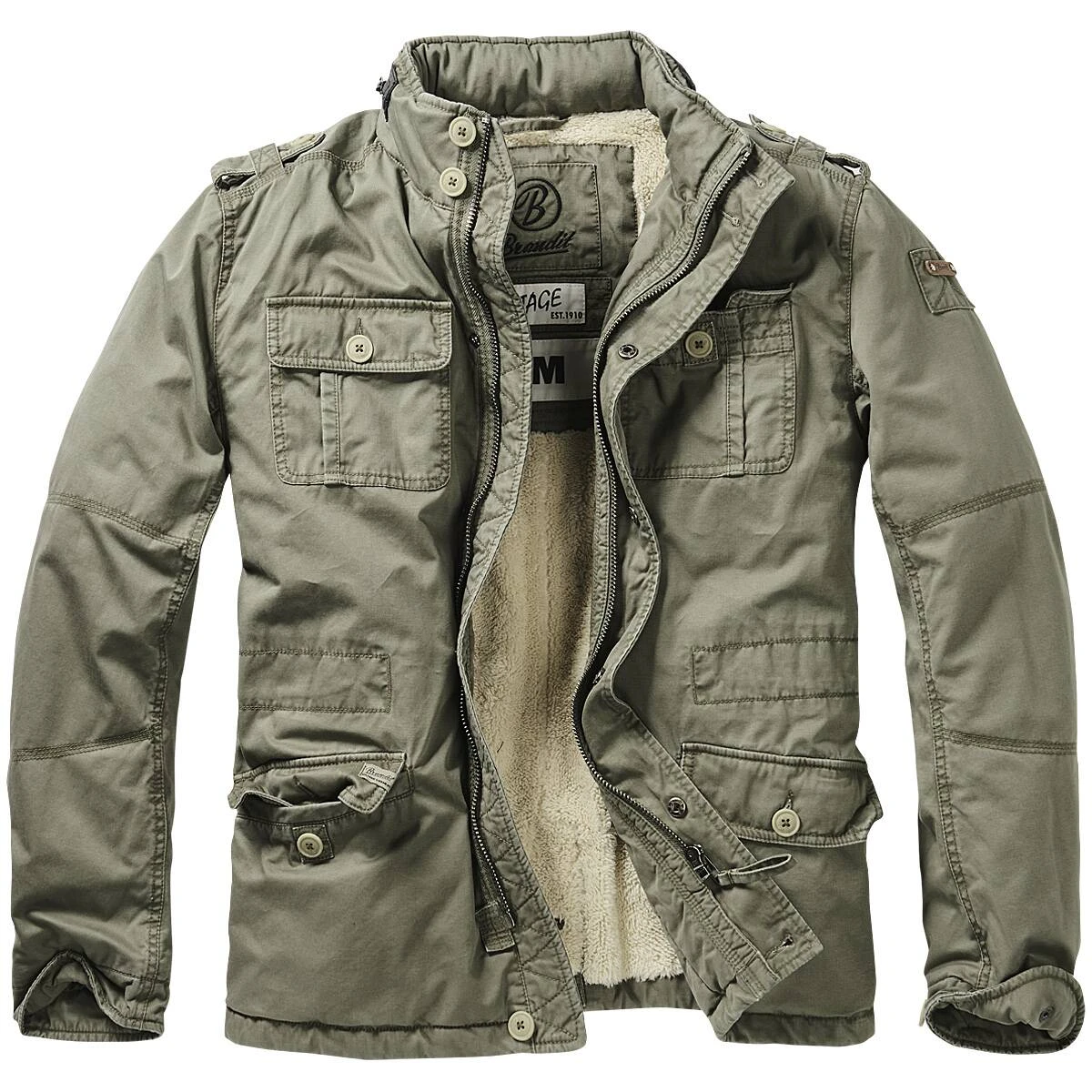 Die beliebte Britannia Jacke gibt es jetzt endlich auch in der Winterausführung. Durch das wunderbar weiche Teddyfutter und die Kapuze ist Sie hervorragend für die kalte Jahreszeit geeignet. Die gerade geschnittene, modifizierte Feldjacke besitzt einen stilvollen Stehkragen mit Kunstlederapplikation und integrierter Kapuze, Logo-Badges am Ärmel sowie Schulterklappen mit Knöpfen. Die Ärmel lassen sich mittels Klett und Druckknopf in der Weite regulieren. In den vier großen Fronttaschen mit Patte und Knopf gibt es ausreichend Stauraum. Der durchgehende Front-Reißverschluss wird durch eine Abdeckleiste geschützt.
