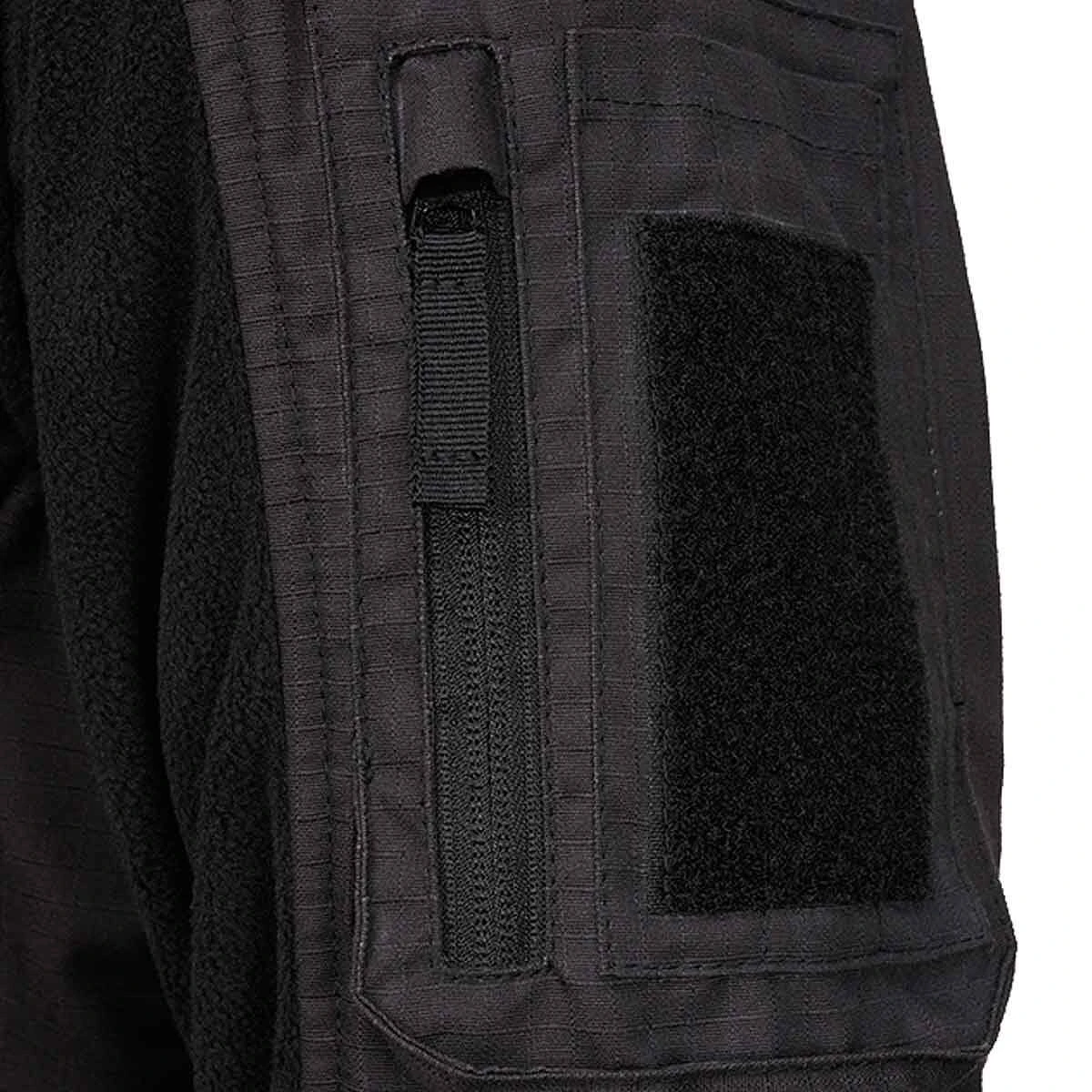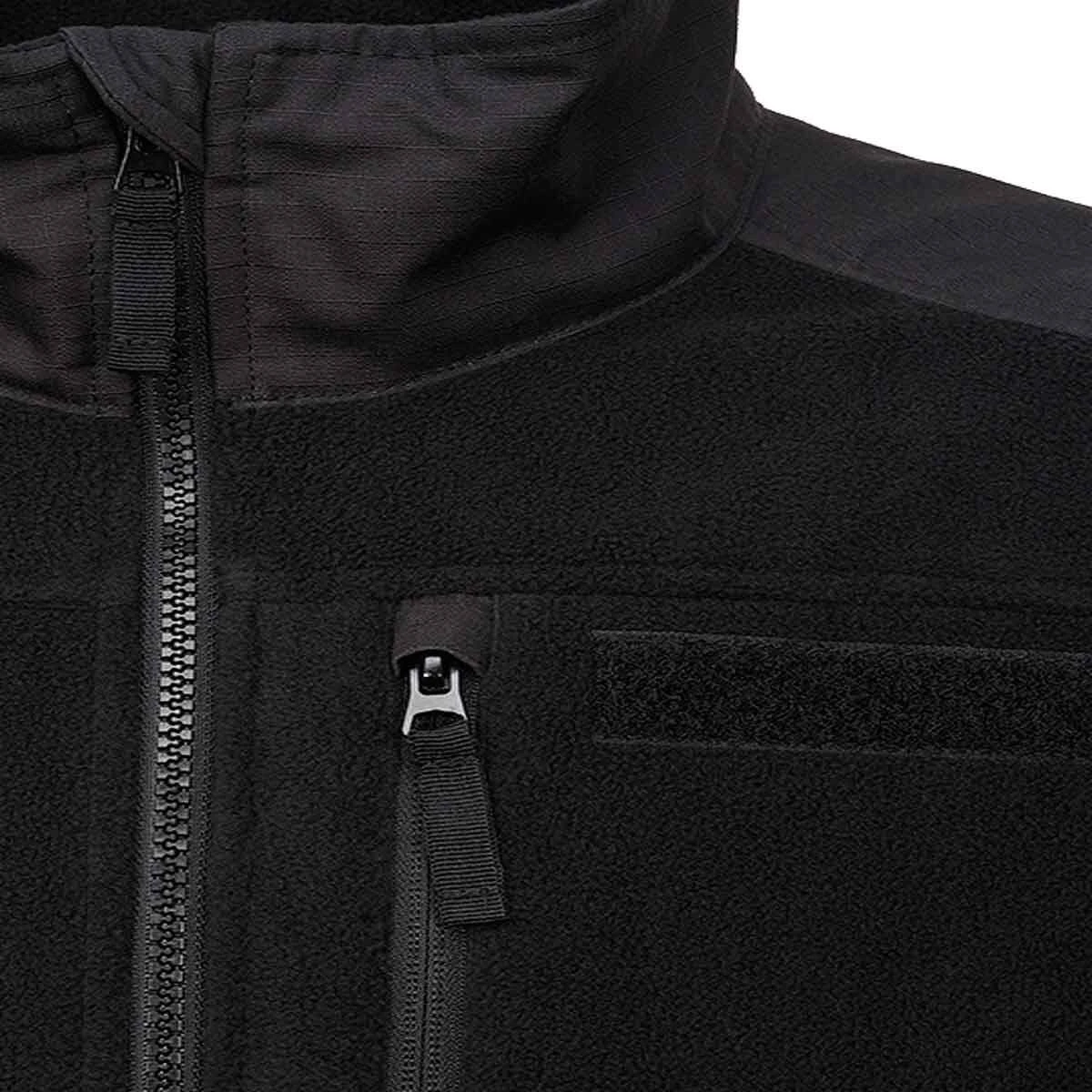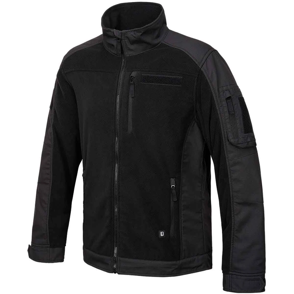 Die schwarze Fleecejacke Ripstop von Brandit mit verlängertem Rückenteil und regulierbaren Saum mit Kordelstopper, ist eine robuste sportliche Fleecejacke aus einem warmen und weichen Fleece-Material. Das robuste, wasserabweisende Ripstop Material hält auch stärkeren Beanspruchungen stand. Der stabile Kunststoffreißverschluss mit hinterlegter Windschutzleiste und dem Kinnschutz lassen garantiert kein kühles Lüftchen durch. Weitere praktische Details sind die 3 Außentaschen mit Reverse-Reißverschlüssen und den Zipper-Pullern für ein einfaches Öffnen und Schließen. Die Innentasche ist ebenfalls mit einem Reißverschluss ausgestattet. An den Oberarmen befinden sich 2 Klettflächen. Eine weitere Klettfläche zum Anbringen eines Namenstreifens befindet sich auf der Brust. Die Armabschlüsse sind mittels Klettverschlusses weitenregulierbar.Â
