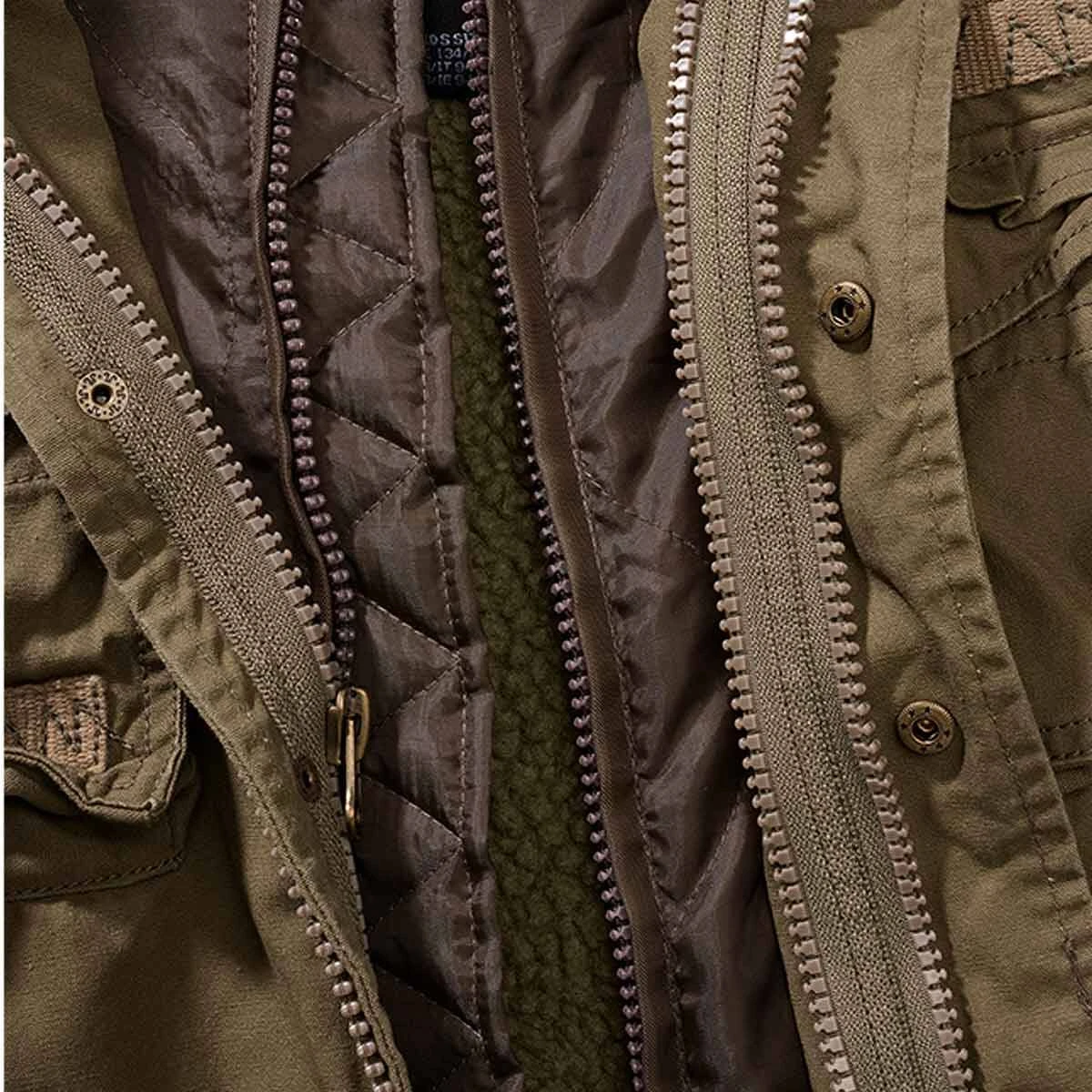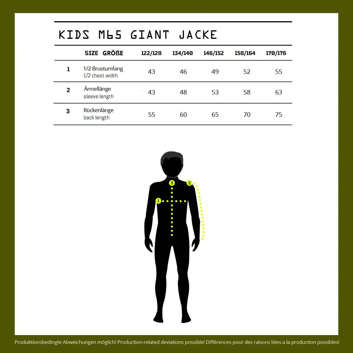 Die Kids M65 Giant Jacke von Brandit ist eine Premiumjacke nach dem Vorbild der Original M65 Jacke. Diese Kinderjacke besteht aus einem robusten und langlebigen Mischgewebe und eignet sich für Schule und Freizeit. Je nach Außentemperatur lässt sich die warme Innenjacke herausnehmen. Die Ärmelenden sind mittels Klettverschlusses verstellbar. Insgesamt 2 seitliche Einschubtaschen, die versteckte Kapuze im Kragen, die fixierten Schulterklappen und die zahlreichen Vintage-Applikationen machen die US M65 Feldjacke für Kinder zu einem absoluten Hingucker.