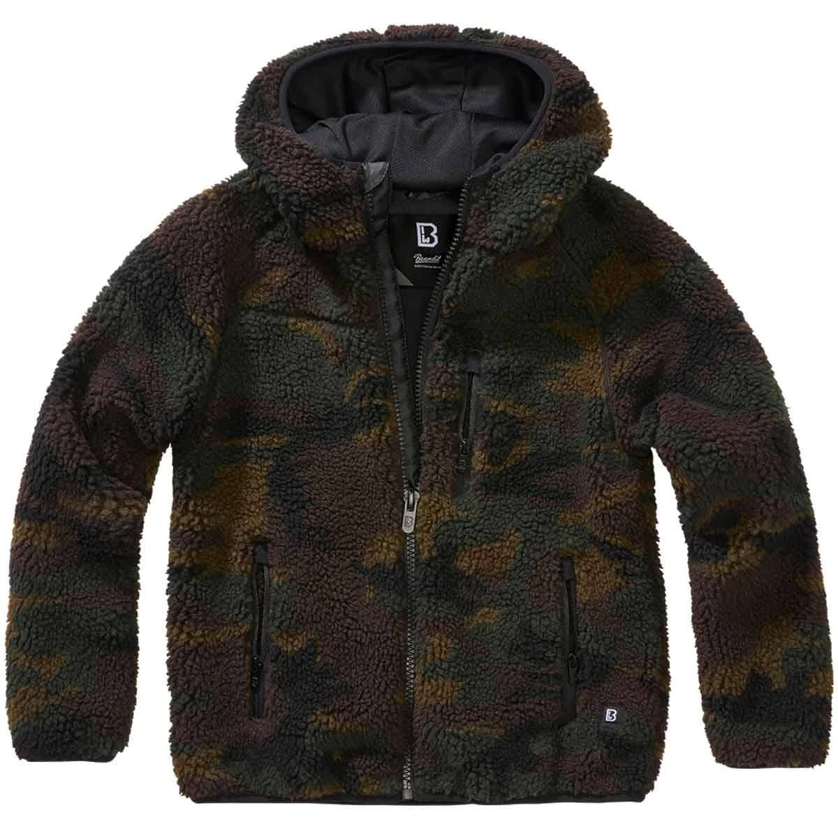Diese Unisex Teddyfleece Kinderjacke von Brandit in woodland ist die richtige Wahl für kühle Tage. Das hochflorige, warme Teddyfleece lässt keine Außenluft durchdringen und sorgt damit für eine hohe Wärmeleistung. Das atmungsaktive Innenfutter garantiert einen guten Wärmeaustausch und damit für ein angenehmes Tragegefühl. Die hochwertige Kids-Fleecejacke bietet zahlreiche praktische Details. Die geräumige Kapuze hält den Kopf warm, der hochwertige Mittelreißverschluss mit Kinnschutz und Windschutzleiste lässt sich einfach öffnen. Die geräumige Brusttasche und die beiden seitlichen Einschubtaschen werden jeweils mit einem Reverse-Reißverschluss geschlossen. Die Innentasche schließt mittels Klettverschluss. Die elastischen Ärmelabschlüsse und der Hüftbund lassen die Kälte draußen. Eine tolle Kinderjacke für die kühle Jahreszeit.