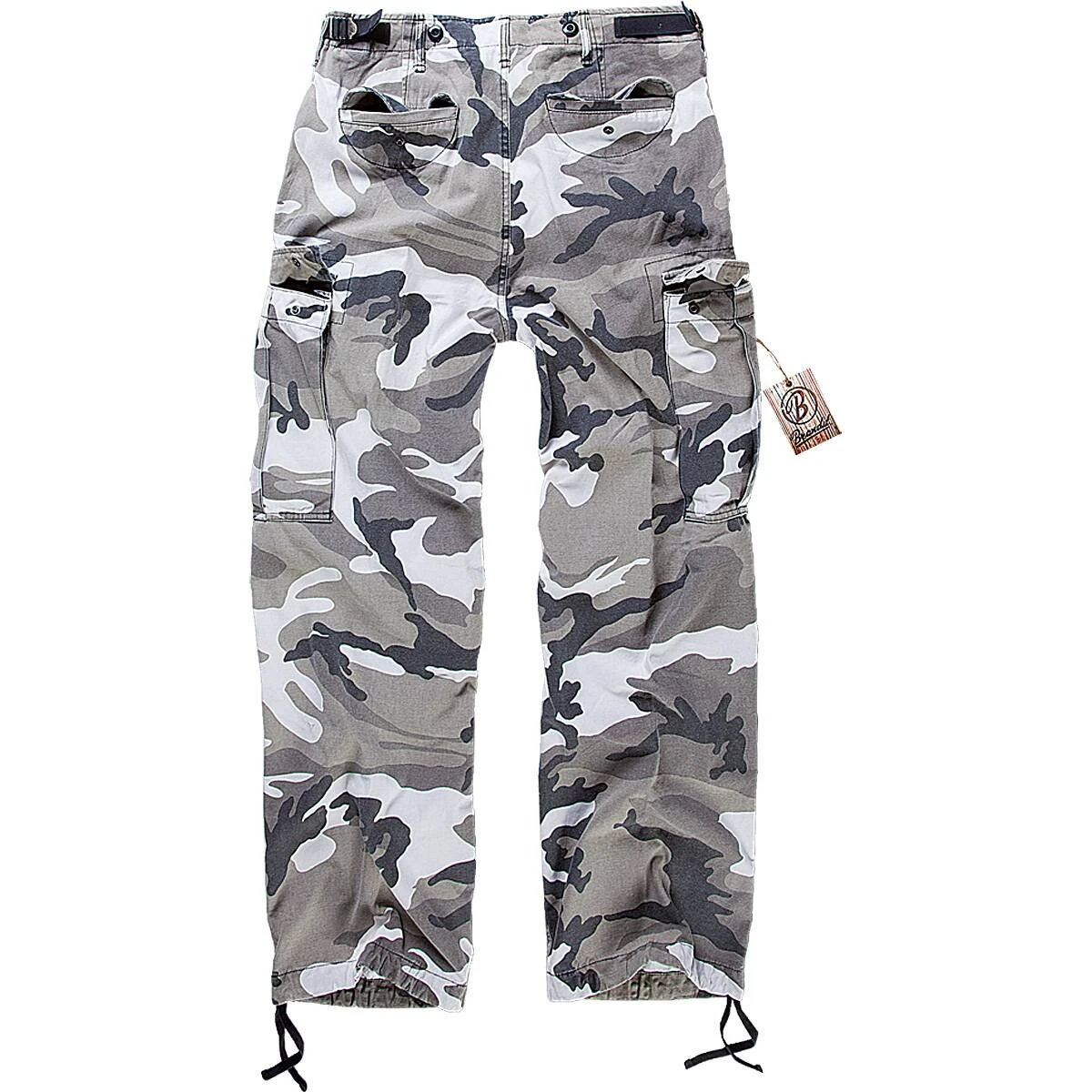 Die Hose lässt sich individuell in der Weite durch Taillengurte regulieren und besitzt 2 große seitliche Beintaschen, 2 Front-Doppel-Taschen (Eingriffstaschen mit zusätzlich aufgesetzten Pattentaschen) sowie 2 Gesäßtaschen. Diese Taschen sind mit Druckknöpfen zu verschließen. Am äußeren Bund befinden sich Knöpfe für Hosenträger. Zusätzlich besitzt die Brandit Trouser Dehnfalten im Kniebereich und Tunnelzüge am Fußsaum. Der Bund wird mit einem Reißverschluss geschlossen (keine Knopfleiste).