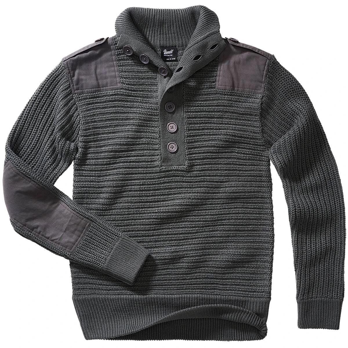 Der anthrazitfarbene Alpin Grobstrick-Pullover von Brandit im zeitlosen Design ist nach dem Vorbild des österreichischen Alpin Armee Pullovers gefertigt worden und überzeugt mit einem weichen, angenehmen Tragegefühl, ganz ohne Kratzen. Die breiten Strickbündchen an Ärmeln und Saum sorgen für Halt, der hohe Kragen mit Knopfleiste leistet an kühlen Tagen gute Dienste. Weitere Details sind die Schulterklappen mit Knopfverschluss und die verstärkten robusten Ellenbogen- & Schulterpartien. Alles in Allem ein robuster Pullover.