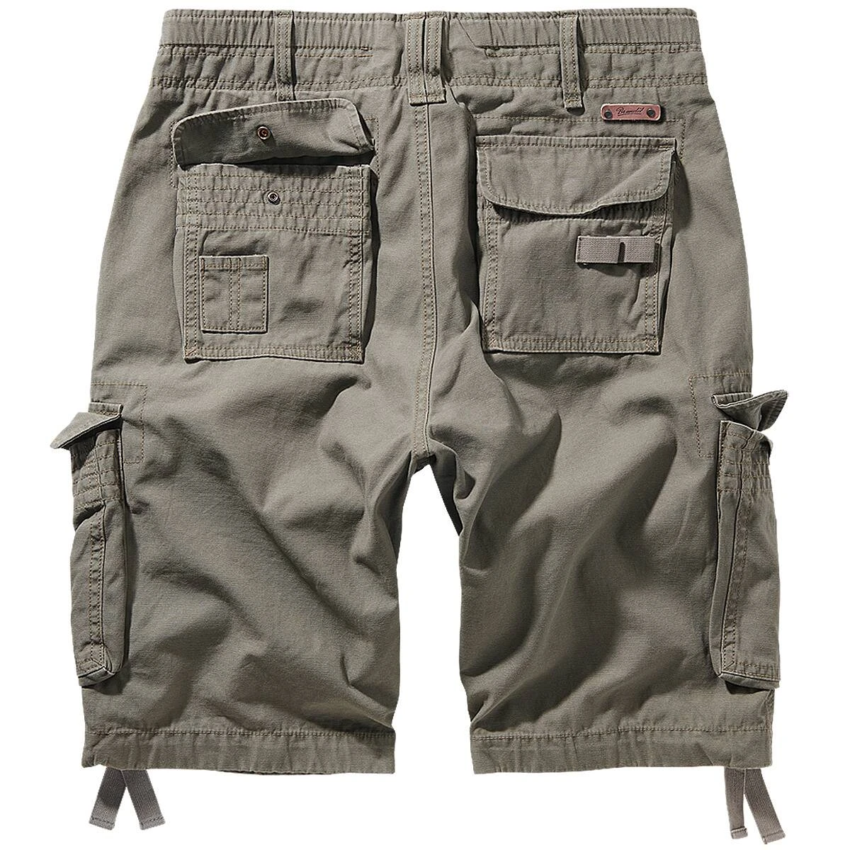 Die Pure Vintage Shorts ist eine exzellent gemachte, zeitlose Cargo-Shorts von Brandit. Sie besticht durch ihren lässigen Schnitt sowie durch ihr leichtes, weiches und strapazierfähiges Baumwoll-Material, welches sich wunderbar angenehm auf der Haut trägt und für optimales Klima an warmen Tagen sorgt. Im Detail besitzt die Shorts zwei große Bein-Cargotaschen mit Patten und Druckknopfverschluss, davon eine mit einer aufgesetzten kleinen Tasche, 2 Front-Eingriffstaschen sowie 2 Gesäßtaschen. Außerdem hat sie einen verdeckten Knopfleistenverschluss, einen mittels Kordelzug verstellbaren Beinsaum sowie am Bund einen verdeckten Kordelzug und Gürtelschlaufen. Damit sitzt die Pure Vintage Shorts perfekt. Der angesagte Vintage-Used-Look wird durch die leicht verwaschene Optik, ein Logo-Patch sowie weiteren Details wie Schlaufen und Ösen erreicht. Auf der linken Cargotasche befindet sich ein toller Aufdruck.