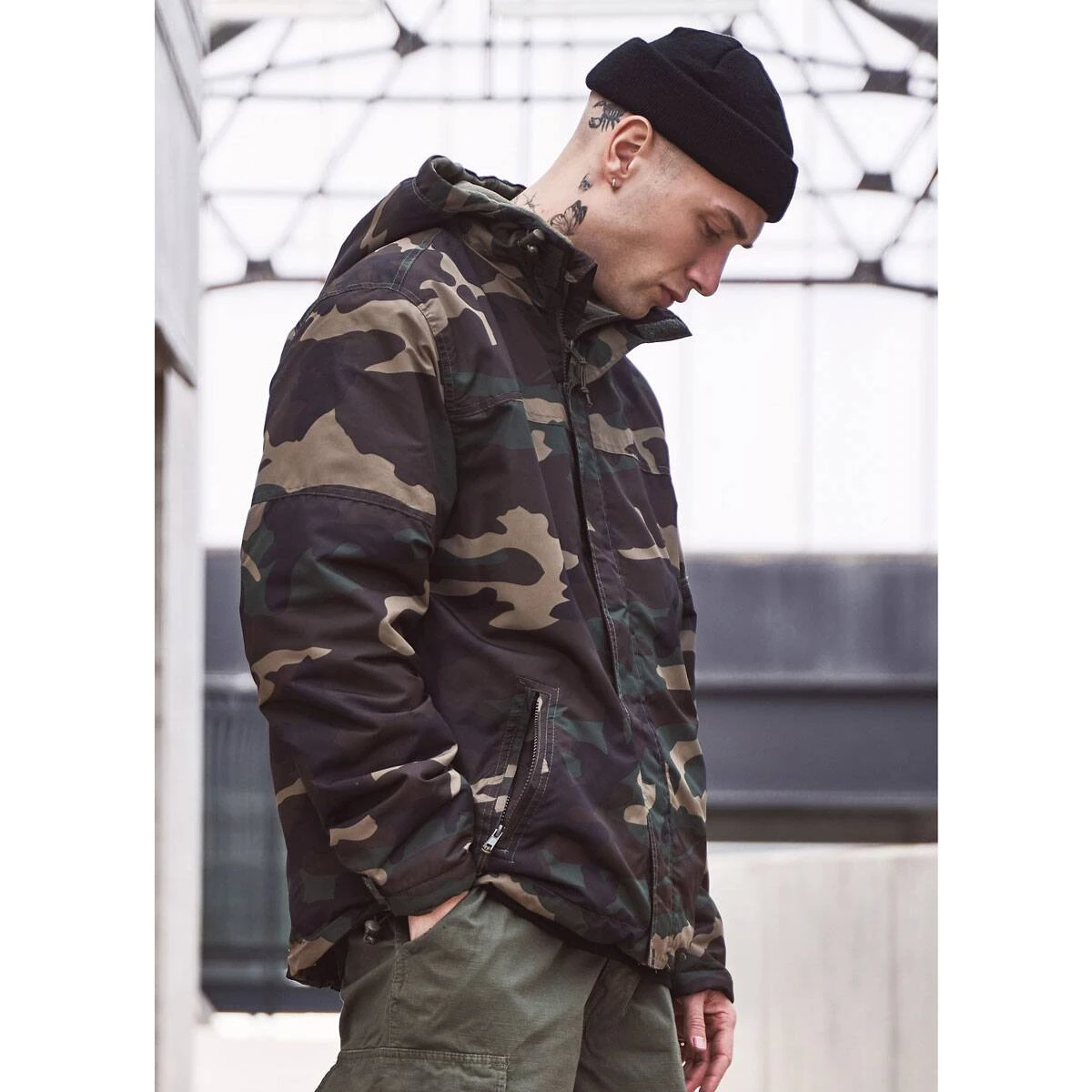 Anziehen und Wohlfühlen: Der Windbreaker mit Frontzip von Brandit ist aufgrund seines warmen Fleecefutters und des wind- und wasserabweisenden Außenmaterials die ideale Jacke für kühle, regnerische und stürmische Tage. Der Windbreaker hat einen stabilen Frontreißverschluss, der durch eine Windschutzleiste mit Klettverschluss bedeckt wird. Die Kapuze ist gefüttert und besitzt einen Kordelzug. Klettverschlüsse an den Ärmelenden und Tunnelzüge im Hüftbund sorgen für eine bequeme Weitenregulierung. Zwei seitliche Einschubtaschen mit Reißverschluss und eine Innentasche bieten ausreichend Platz für Dinge, die unbedingt dabei sein müssen.