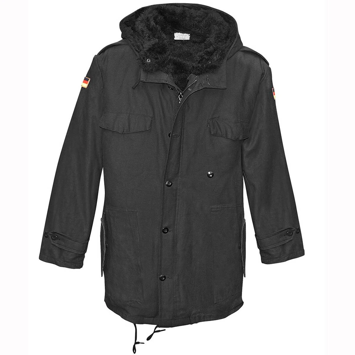 Den bekannten und bewährten Bundeswehr Parka gibt es nei uns jetzt auch in schwarz. Der BW Parka besitzt eine feste Kapuze und ein ausknöpfbares Webpelzfutter. Des Weiteren hat er 4 große Außentaschen, eine Innentasche, eine verdeckte Knopfleiste sowie einen qualitativ hochwertigen Reißverschluss. Er lässt sich an Taille und Saum schnüren und die Ärmelbündchen sind verstellbar. In der Kapuze befindet sich ein Zugband. Es handelt sich selbstverständlich um unbenutzte Neuware in ausgezeichnerter Qualität!