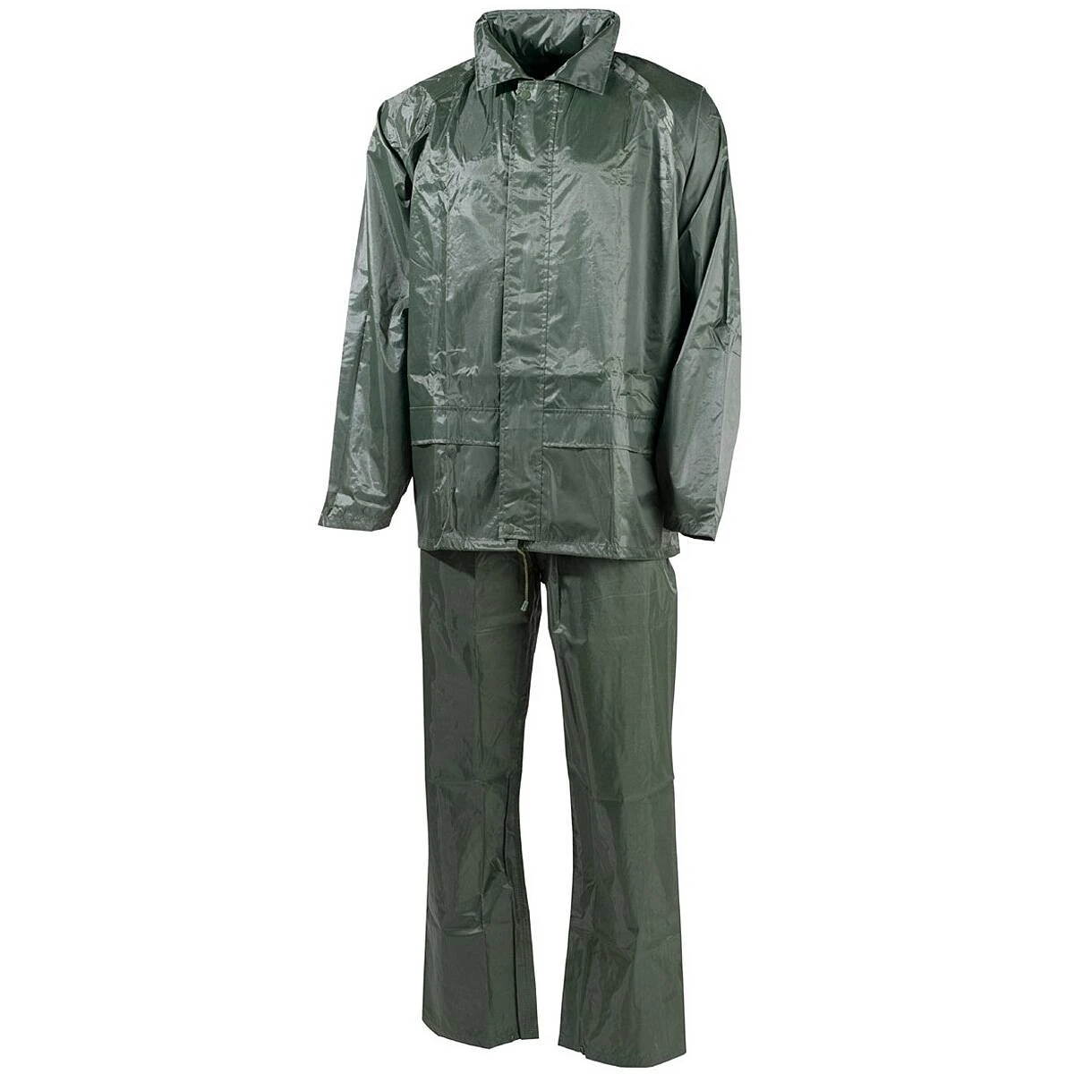 Dieser sehr leichte Wetterschutzanzug besticht durch sein kleines Packmaß und wird inkl. Tasche geliefert. Die Jacke besitzt einen Frontreißverschluss, eine integrierte Kapuze im Kragen sowie 2 seitliche Einschubtaschen. Sie hat einen Abschlussbund mit Kordel und Stopper. Die weit geschnittene Regenhose besitzt 2 Durchgreiftaschen und am Hosenbund einen elastischen Gummizug. Am Beinabschluss befinden sich Druckknöpfe.