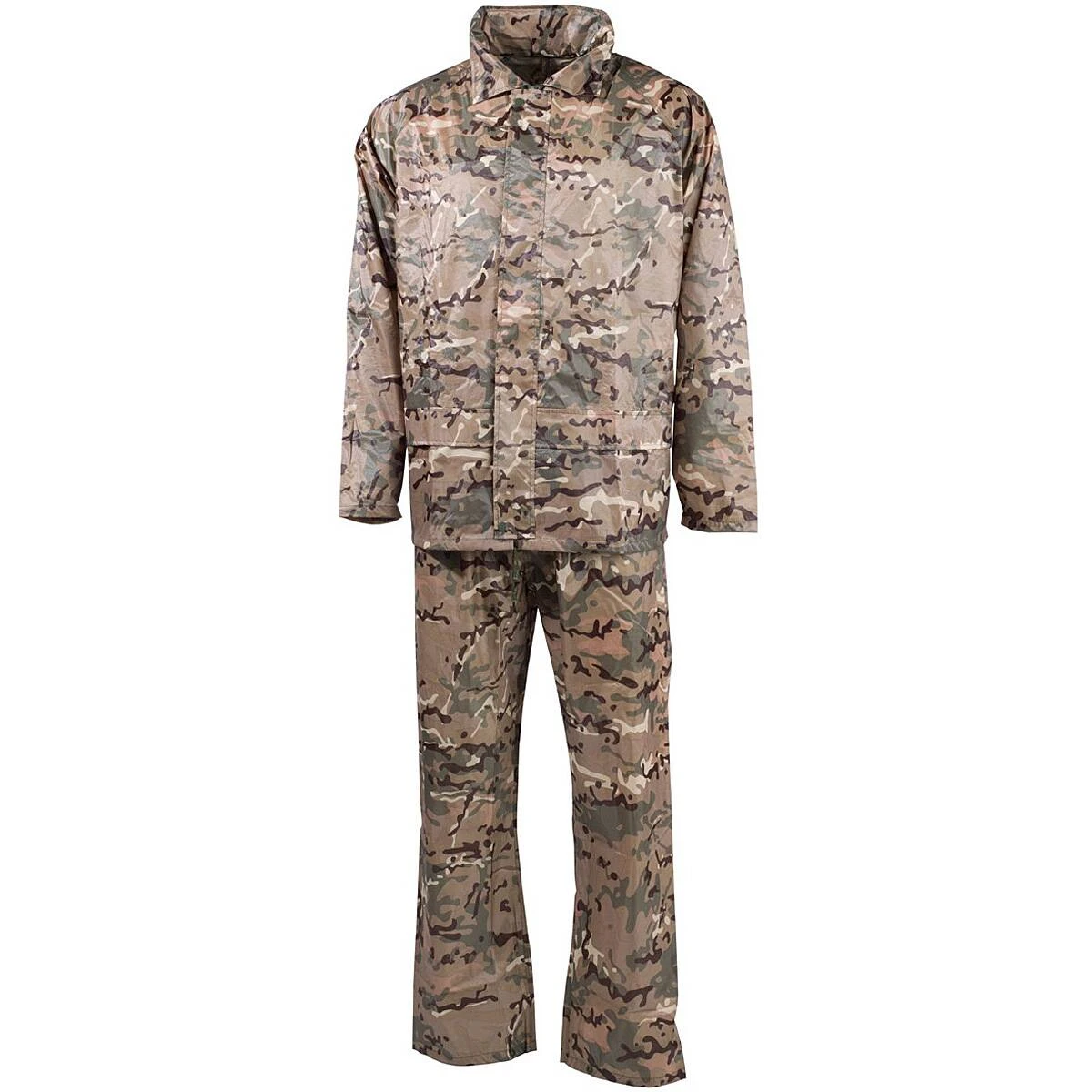 Dieser sehr leichte Wetterschutzanzug besticht durch sein kleines Packmaß und wird inkl. Tasche geliefert. Die Jacke besitzt einen Frontreißverschluss, eine integrierte Kapuze im Kragen sowie 2 seitliche Einschubtaschen. Sie hat einen Abschlussbund mit Kordel und Stopper. Die weit geschnittene Regenhose besitzt 2 Durchgreiftaschen und am Hosenbund einen elastischen Gummizug. Am Beinabschluss befinden sich Druckknöpfe.